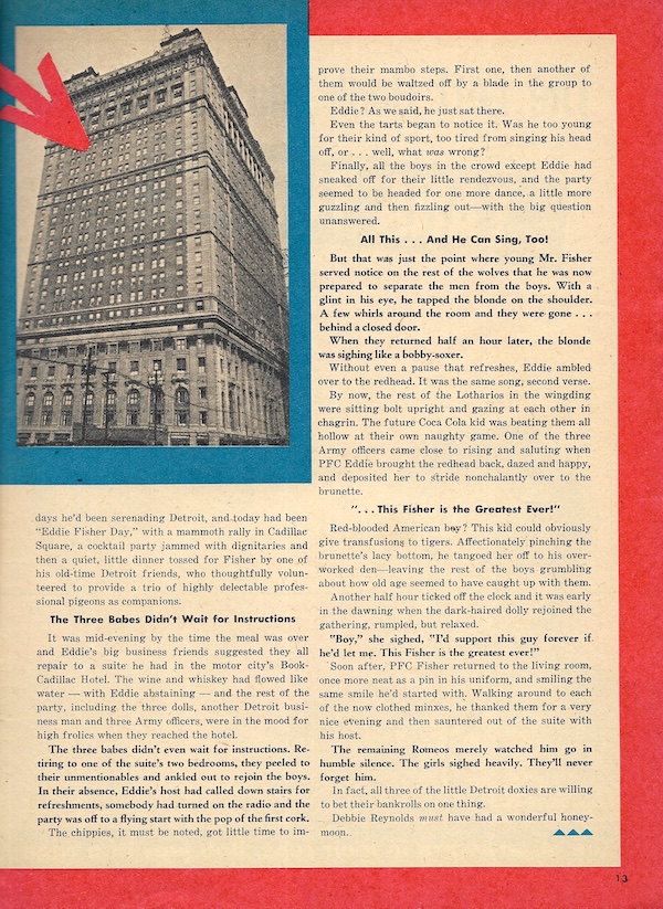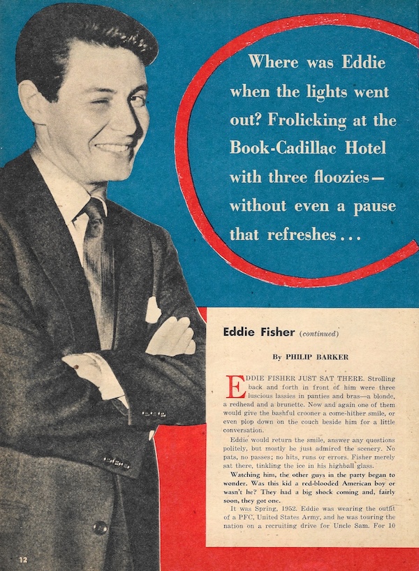 Moving on, Eddie Fisher is said to have bedded three women, one after another, in a room in Detroit’s Cadillac Hotel. We doubt Fisher complained about this tale. For one thing, it’s said to have happened in 1952, which was before he was married to Debbie Reynolds, and it makes him out to be a superlover: The girls sighed heavily. They’ll never forget him.