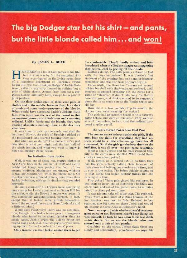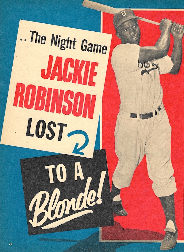 Star baseballer Jackie Robinson is said to have borrowed boxer Joe Louis’s apartment in the Sugar Hill section of New York City and called up a couple of beautiful girls one sweltering summer night. The enticement? Just like in The Seven Year Itch it was air conditioning, according to Confidential. Once there, Jackie convinced the girls to play strip poker. If the girls lost, they’d give up the goodies to Jackie and his two pals. If not, no dice. Down to the final hand between he and a blonde beauty, both clad only in underwear, Jackie lost.