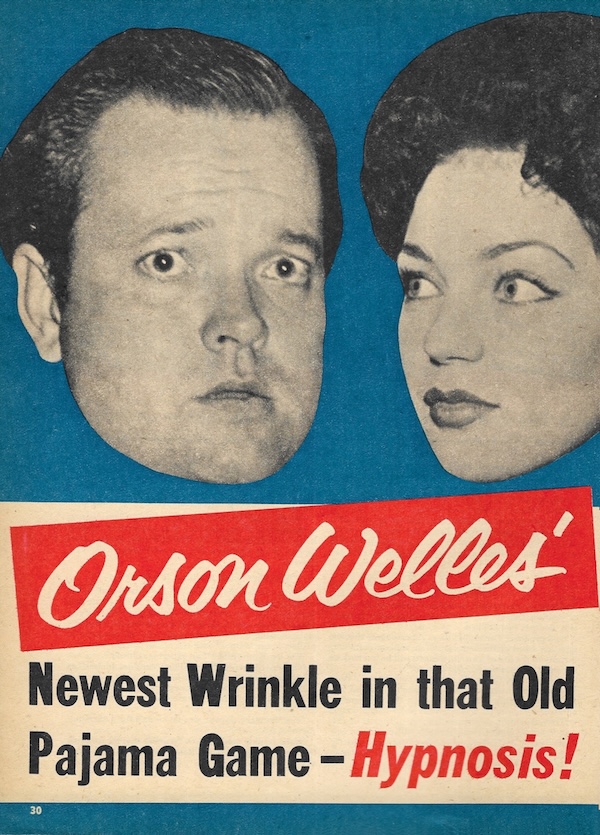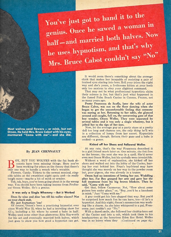 Confidential claims that Orson Welles, allegedly a practicing hypnotist, used his talents to seduce Francesca de Scaffa: Fat Boy grasped her by the arm and gave her the full treatment from his big brown blinkers. Then he said, “Come with me.” The story goes on to say he made her dance around nude in his hotel room and more, but who was the witness on this one? Did Confidential have a reporter at the keyhole? At least the Jackie Robinson story has a few plausible witnesses. Who revealed this tale? Welles? De Scaffa? Hmm…