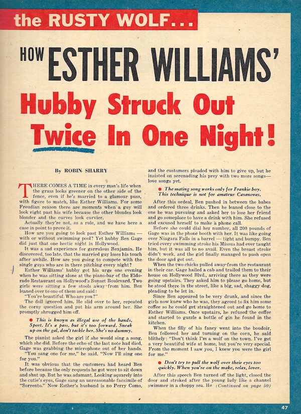 The magazine goes on and on. Others stretched on the rack include Esther Williams, Joe Kirkwood, Cathy Downs, and William Wellman. As we said at the top, the names are fading into the mists of time, but the passions, the pratfalls, the loves, the rages, all make for fascinating reading. We enjoy doing our part to bring these old stories into the digital realm, and we hope they inspire you to make legends of your own. They won’t be remembered forever, but the fun is in living them. More scans below.