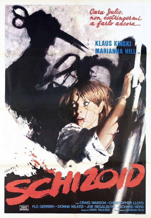 Under-appreciated Italian artist Mario Ferrari, aka Mafé, produced two posters for the Italian release of the U.S.-made Schizoid, both making use of scissors as a motif. These are great, especially the top one in which the female figure’s face is subtly warped. Is the movie warped too? It’s a giallo slasher flick with Klaus Kinski top billed, who it must be said was quite a man. He was accused by his daughter Pola of raping her, was described by his other daughter Nastassja as touching her in a sexual way, left female co-stars bruised and traumatized, and was clinically diagnosed with antisocial personality disorder—i.e. he was a psychopath. We usually don’t drag up the personal failings, vicious politics, or past crimes of actors or authors, but there’s a limit. And now you know.