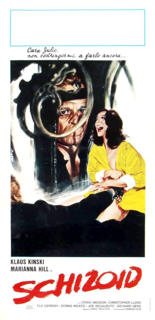 Schizoid has problems owing largely to the music and co-star Craig Wasson’s awful acting as Hill’s ex. In addition, Kinski was possibly cast specifically because he looks so creepy, in order for him to be a walking red herring. Okay, but he’s also miscast in the sense that he’s implausible in the role of a therapist. There’s simply nothing calming about him. Because he succeeded in some very tough, even epic, roles during his career you’d never think he couldn’t ace the part of a simple head doctor, but he doesn’t. Even so, Hill does well as a woman constantly unnerved by the men around her. She should be unnerved—they’re deplorable. After premiering in the U.S. in 1980 Schizoid opened in Italy today in 1981.
