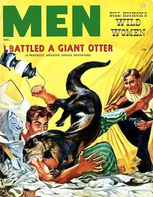 The scene on the cover of this famous issue of Men magazine always struck us as absurd. In fact, animal attack covers from vintage mens magazines tend to be more funny than frightening, which is why we shared this one some years ago. But it seems as though reality has strong sense of irony.