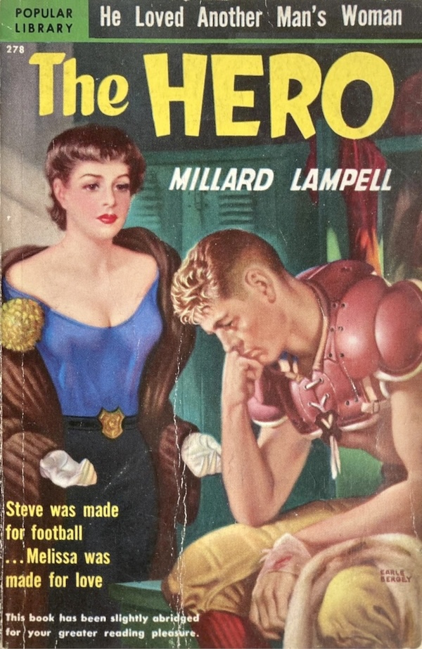 Earle Bergey, the man behind thousands of covers for pulp magazines and paperbacks, painted this piece for Millard Lampell’s novel The Hero. It first appeared in 1949, with this Popular Library edition coming in 1950. Interestingly, Lampell was first a musician, a member of a folk group called the Almanac Singers with Woody Guthrie, Pete Seeger, and Lee Hayes. Later he wrote radio scripts before finally turning to novels. His literary career was curtailed for some years because he was blacklisted for refusing to snitch to the House Un-American Activities Committee, but he eventually wrote plays, and later returned to radio. The Hero turned out to be his only novel, but gratifyingly, he did get to see it adapted into the 1951 movie Saturday’s Hero, starring John Derek and Donna Reed. Back to the subject of Bergey—see some nice covers from him here, here, and here.
