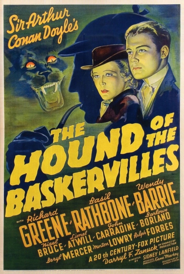 It was in 1914 that Arthur Conan Doyle’s 1902 Sherlock Holmes mystery The Hound of the Baskervilles was adapted into the first of thirty movies—and counting, as of last year’s actionized Bengali language effort Saralakkha Holmes. But with all those choices we liked the above poster the most, so the iteration starring Basil Rathbone, Nigel Bruce, Richard Greene, and Wendy Barrie is the one we watched.