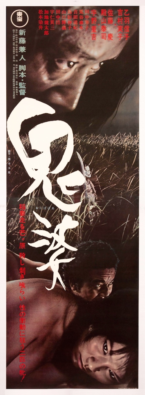 This fine tatekan style poster was made to promote the Japanese historical drama Onibaba. That’s a word from Japanese folklore meaning something like “witch,” or “hag,” but with a sort of hellish or otherworldly connotation. Because of this theme, some sites call Onibaba a horror movie. Okay, sure. Whatever floats their boats. But whether you stretch the definition of horror to inlcude the film or not, there’s no doubt that it’s a dark excursion.