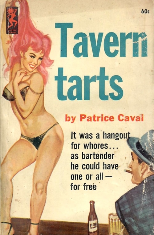 He doesn’t know tart but he knows what he likes. Tavern Tarts came in 1964 from Playtime Books via the typewriter of Patrice Caval, who also produced Sex Thief, Loving Couples, and Satan’s Mate. A pseudonym? Maybe, but we don’t know for whom. The art is by Robert Bonfils.
