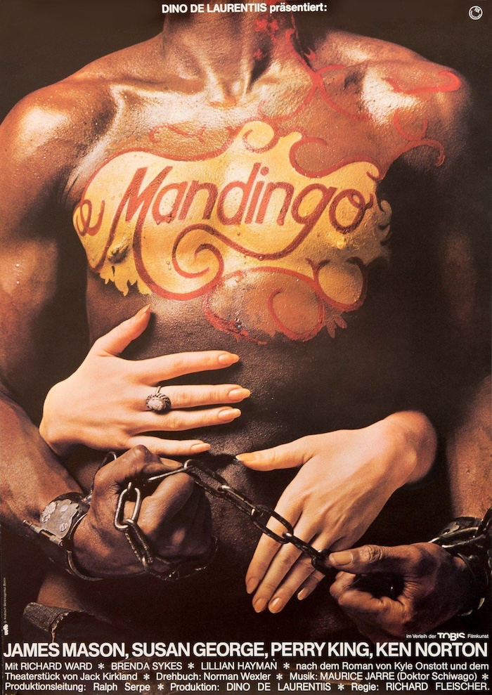 Mandingo has a reputation as a piece of campy blaxploitation, but we just watched it today and it’s clear that reputations and reality sometimes don’t connect. The film has its flaws—some of the acting is less-than-scintillating, and ex-heavyweight boxing champion Ken Norton is ponderous as the lead character Mede—but overall Mandingo is a serious and realistic depiction of the antebellum American south’s slave culture. The provocative poster you see above was produced for Mandingo’s West German run, and it’s a stunning piece of art.