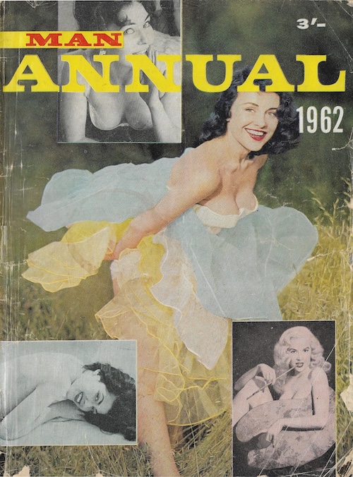Today we have for you a special annual edition of the Australian magazine Man, published this month in 1962. As a year-end compendium, it mostly dispenses with text and instead highlights glamour models and cartoons. The models include Diane Webber, aka Marguerite Empey (on the title page and posing later with a guitar), and Betty Brosmer (inset on the cover). The cartoons, mostly by Phil Belbin signing as “Humph,” are only intermittently clever, and are occasionally offensive. We document those anyway because we don’t believe such material should simply go down the memory hole. Man was double-edged—it was visually spectacular, yet disseminated stereotypes. The page count on this issue runs about seventy. We managed to scan fifty. We’d like to have done more, but it takes time plus processing, and we admit we ran out of steam. We have more annuals we’ll scan down the line.