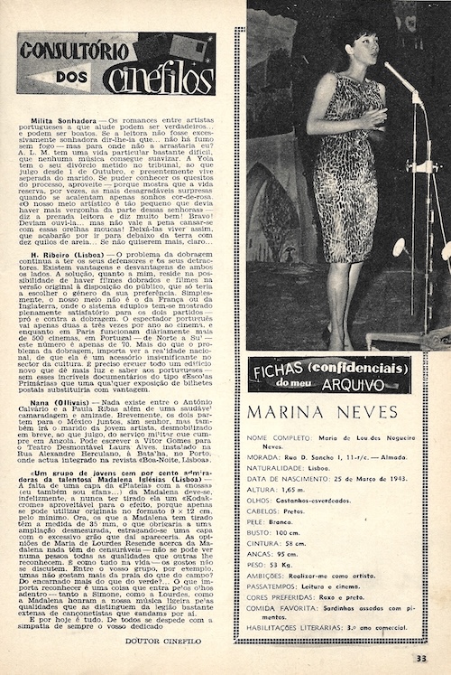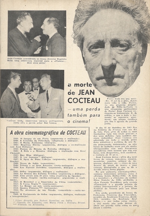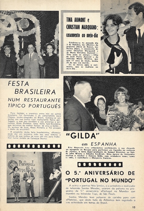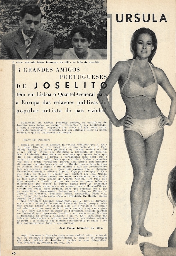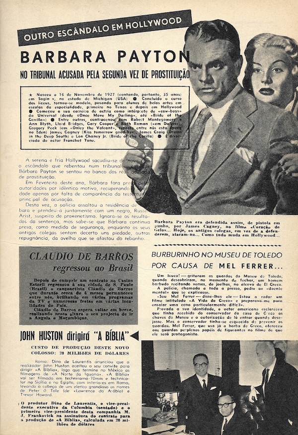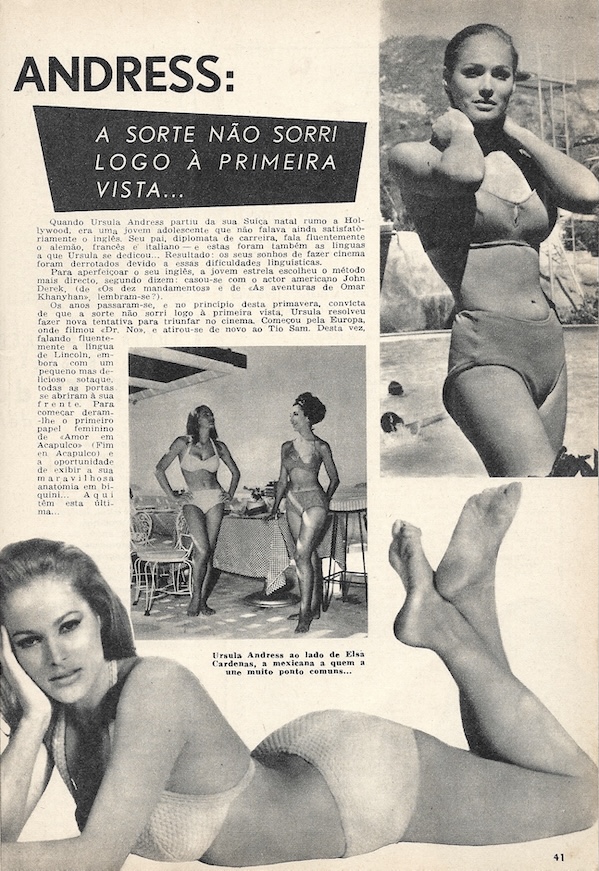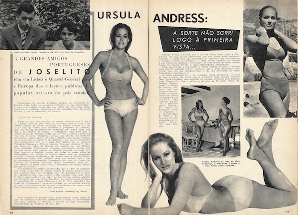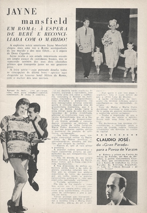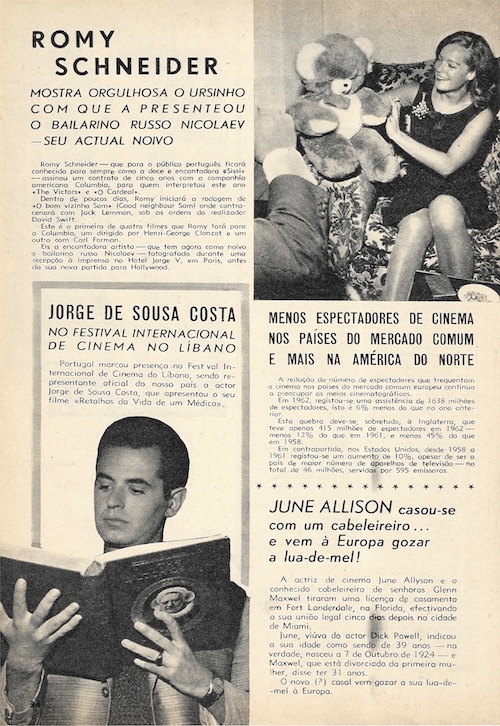 We picked up this November 1963 issue of the Portuguese pop culture magazine Plateia in Lisbon a while back because it had a rare shot of U.S. actress Carol Lynley on the cover. The art is never amazing inside this publication, but at three euros we feel we got a good deal, and there are photos we’ve never seen before, even if small and printed on cheap paper. Superstars Ursula Andress, Catherine Deneuve, Jayne Mansfield, Gregory Peck, and Romy Schneider show up, as do more Eurocentric screen performers such as Sara Montiel, Maximillian Schell, and Rosa Schiaffino. Also making appearances are playwright Jean Cocteau and singer Amália Rodrigues. In the end Plateia covers a lot of entertainment territory, making for a good timekiller for readers back then, and a nice item in our stacks today. We have about twenty-five scans below, and you can see another issue at this link.