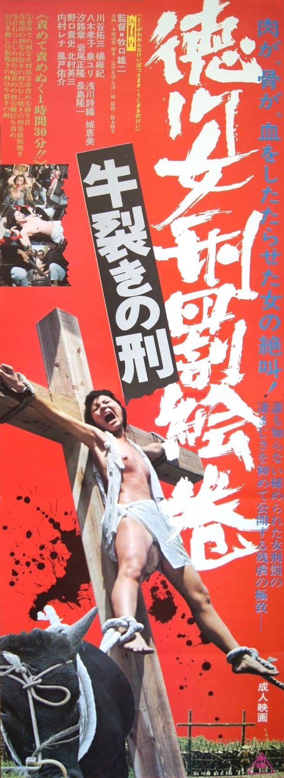 This rare and disturbing tatekan format promo was made for a movie titled Tokugawa onna keibatsu-emaki: Ushi-zaki no kei, known in English as The Joy of Torture 2: Oxen Split Torturing, or often Oxen Split Torturing, or sometimes merely Shogun’s Sadism. It falls into a category of Japanese cinema known as ero guro which combines elements of horror, sex, and general depravity. In essence, it’s a loose precursor to films like Saw, except of course, American torture films generally omit anything sexual, that being a bridge too far for those audiences. Not so in Japan. To set the mood, The Joy of Torture 2 even opens with credits atop documentary footage of various atrocities—up to and including incinerated victims of the Nagasaki nuclear bombing.