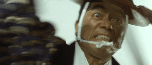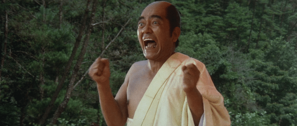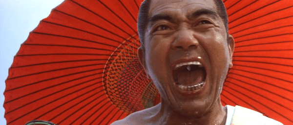 The narrative section of the movie is divided into two stories, one in the 1600s, and the second in the 1800s. In the first, a cruel Shogun is bored by the usual tortures, and demands new and horrifying methods that he can really enjoy as they’re applied to his shogunate’s pesky Christians, who he’s trying to make renounce their religion. We’d be remiss if we didn’t give you a close look at this insane character played by Akira Shioji. Hold on to your eyeballs: