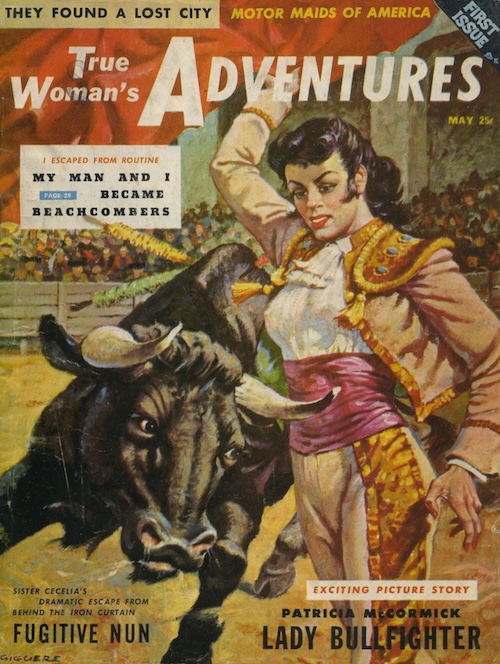 We’ve written a lot about vintage men’s adventure magazines. Today the tables turn. Above you see the cover of a May 1956 issue of True Woman’s Adventures. We’re not going to kid you, though—it’s still a men’s magazine. Easiest way to tell? There are no photos of studs in bathing suits. But even though this women’s magazine is really a men’s magazine, it at least celebrates rugged women, with stories on bullfighter Patricia McCormick, French aviator Maryse Bastié, and explorer/travel writer Ginger Lamb. We’d like to do a deep dive into their biographies, but it’ll have to wait for another day.
