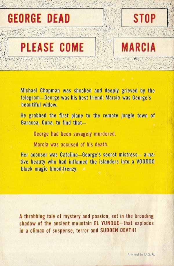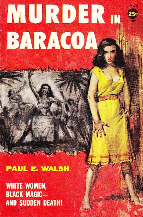 In Paul E. Walsh’s 1958 novel Murder in Baracoa, one of the characters remarks that the average person “goes away from Cuba remembering nothing but the nightclubs of Havana.” Walsh seemed determined to remedy that by keeping his narrative well away from the capital, as his protagonist, magazine illustrator Michael Chapman, goes to the seaside town of Baracoa upon the murder of his friend via poisoning, which in classic fashion has been deemed an accident by disinterested authorities. Clearly there’s something fishy going on, and not a simple murder, but an intricate conspiracy of some sort. Chapman starts to dig. Maybe we should start labeling these “find-my-friend’s-killer” novels, since there are so many.
