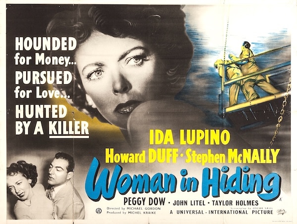 If everyone were as good as Ida Lupino all vintage films would be a sheer pleasure to watch. She headlines Woman in Hiding, in which she plays a new bride to Stephen McNally, who she realizes married her to take control of her father’s lumber mill. When she threatens to annul the marriage he tries to arrange her death, tampering with a car that careens off a bridge and into a river. Lupino survives and hides in the woods, but McNally won’t be convinced she’s dead until he sees a body, which authorities fail to pull from the water. Soon there’s a search for her, with a $5,000 reward offered by McNally. In her efforts to remain hidden, Lupino runs into Howard Duff, who wants to help but tips off McNally without realizing he might be signing Lupino’s death warrant.
