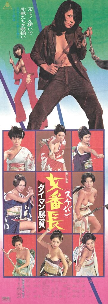 “Sukeban” is a Japanese word that means, basically, “girl gangster.” You see a collection of them on this poster for Sukeban: Taiman shobu, but the most important one is the boss—or banchô—Reiko Ike, who sits atop the art and who we saw just a couple of days ago. The movie, known in the U.S. as Girl Boss 6: Mano a Mano, or sometimes Girl Boss: Diamond Showdown, premiered today in 1974, and is a staple entry in Toei Company’s pinky violence cycle, the sixth entry in a series.