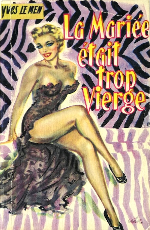 This beautiful cover is French illustrator Jacques Thibésart in top form. He painted this for Yves le Men’s 1953 novel La mariée était trop vierge, the title of which means “the bride was too much of a virgin.” Sounds like a typical sleaze novel to us, but since it’s French we guess it’s erotica. You can see another nice Le Fétiche cover by Thibésart here.
